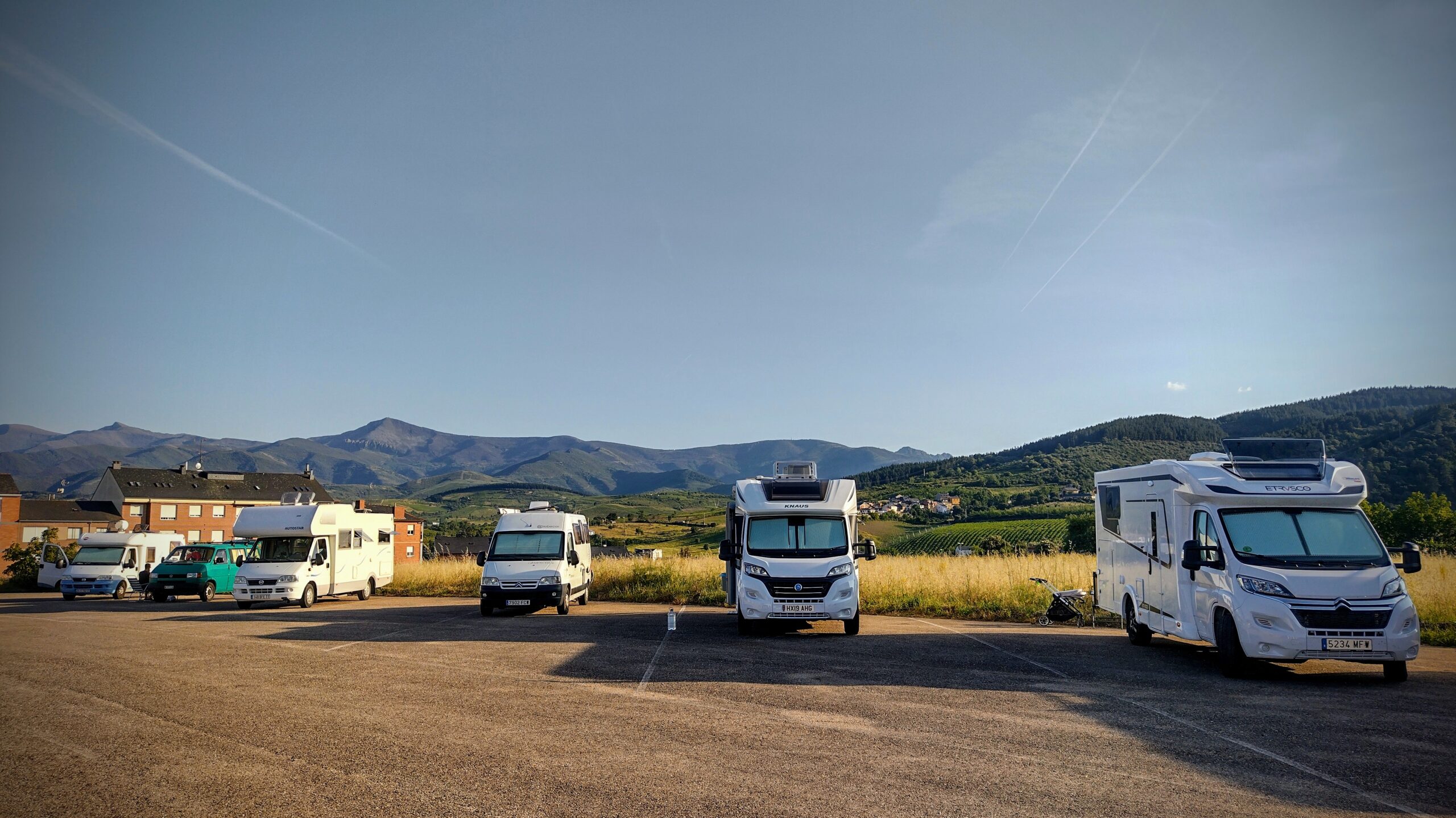 Descending into Ponferrada via a seemingly endless sequence of roundabouts, feeding in the local mountain roads, we found free parking for ‘autocaravanas’ with a view of the surrounding peaks.