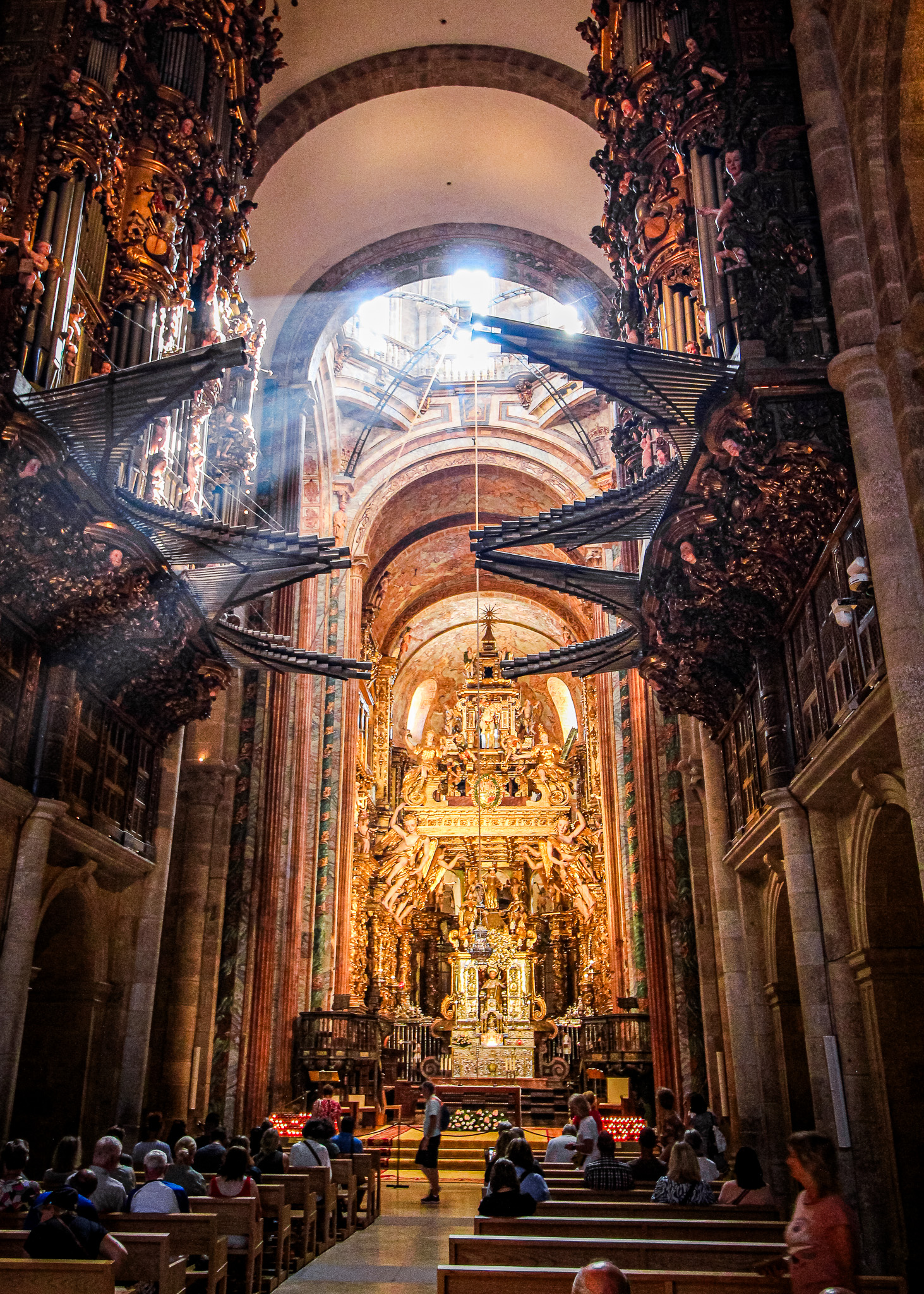 In front of the altar, the gigantic botafumerio, or senser, was suspended on heavy ropes that require eight tiraboleiros in red robes to pull it in a swinging motion and reach speeds of 50mph as it dispenses 40kgs of thick clouds of incense.