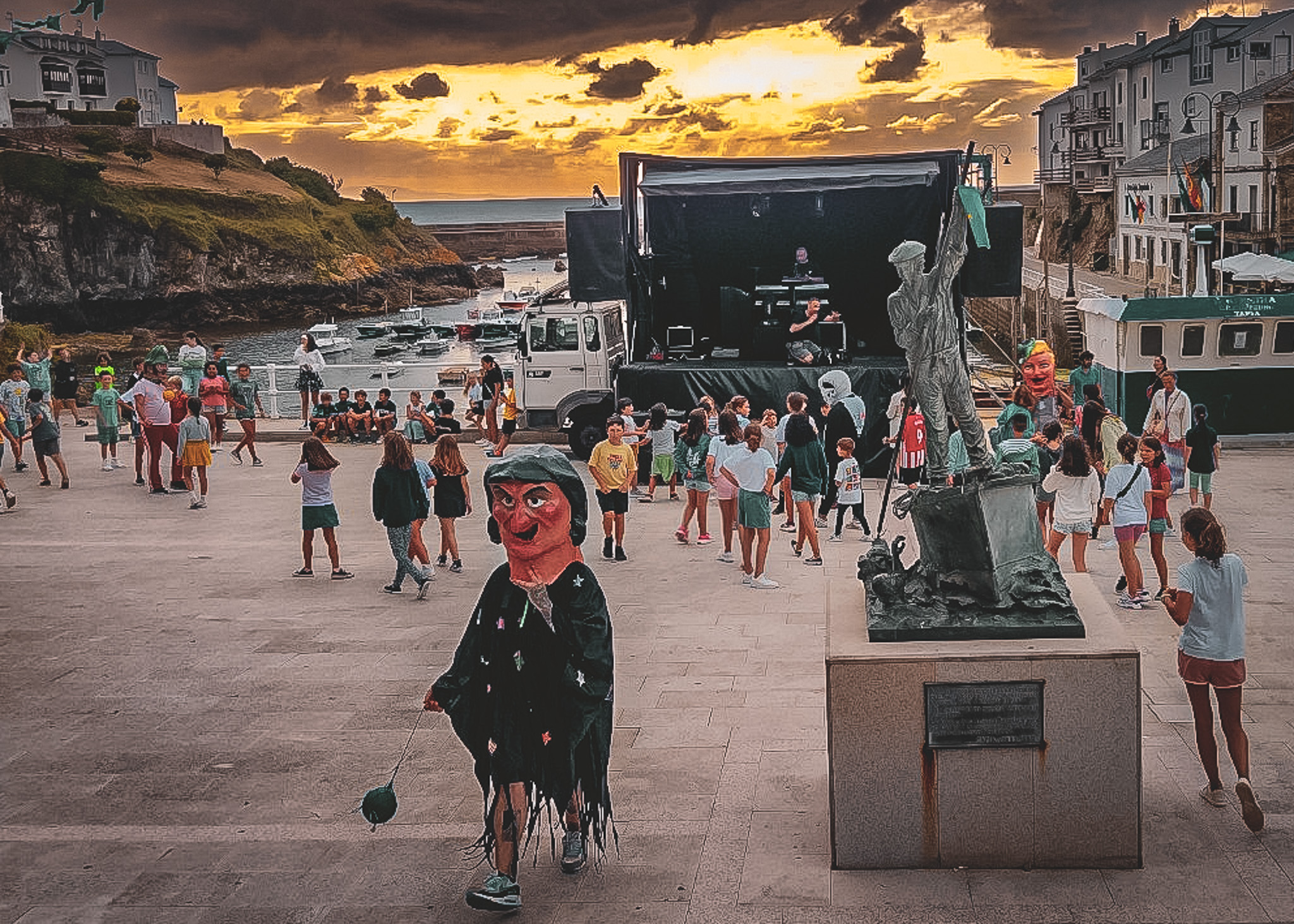 Reunited a chaotic few minutes later, we joined parents and grandparents at one of the many harbour bars and watched for an hour, the various ‘funny big heads’ attempt to terrorise the children. The masks were huge and unwieldy causing each of their wearers to put their hand in the mouth to anchor the head on. Together with the wild wheeling of the leashes and mad dancing movements it made for a slightly deranged sight, but one of high spirits and enjoyment.